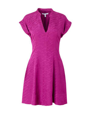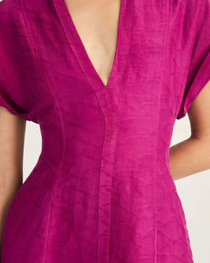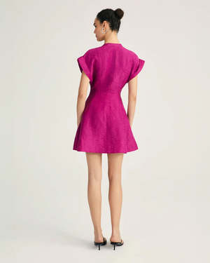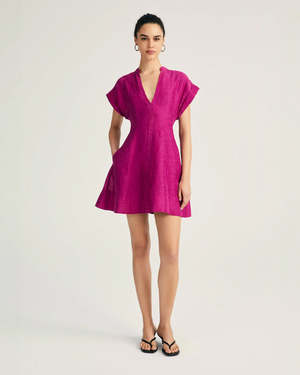The Christina Short Sleeve Mini Dress in Hibiscus by Derek Lam is a fit and flare mini dress featuring a subtle, textured pattern, princess seaming, cuffed shoulder, and v-neckline. - 85% Viscose, 15% Linen / Lining: 100% Polyester - #TP425382PSS