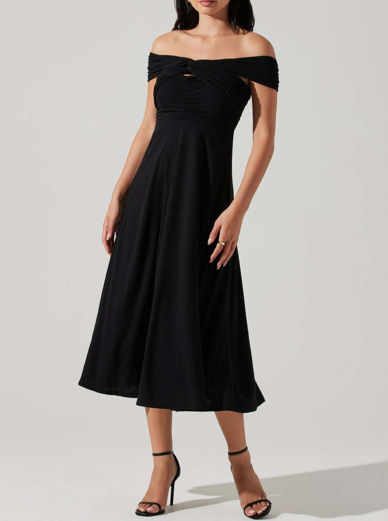 Our Black Off the Shoulder Balto Dress is effortlessly elegant. The flattering off-the-shoulder design accentuates your neckline while the ruched detailing on the bodice adds a classic touch to this timeless piece. PRODUCT DETAILS - Fully lined - Hand wash cold, do not bleach, line dry, do not iron, do not tumble dry - Self: 59% Rayon, 41% Polyester / Lining: 95% Polyester, 5% Elastane SIZE + FIT - XS: Bust 32-33" Waist 24-25" Hip 34-35" - S: Bust 34-35" Waist 26-27" Hip 36-37" - M: Bust 36-37" Waist 28-29" Hip 38-39" - L: Bust 38-39" Waist 30-31" Hip 40-41" - Length: 49" - Model is wearing size S - Model height is 5'8"