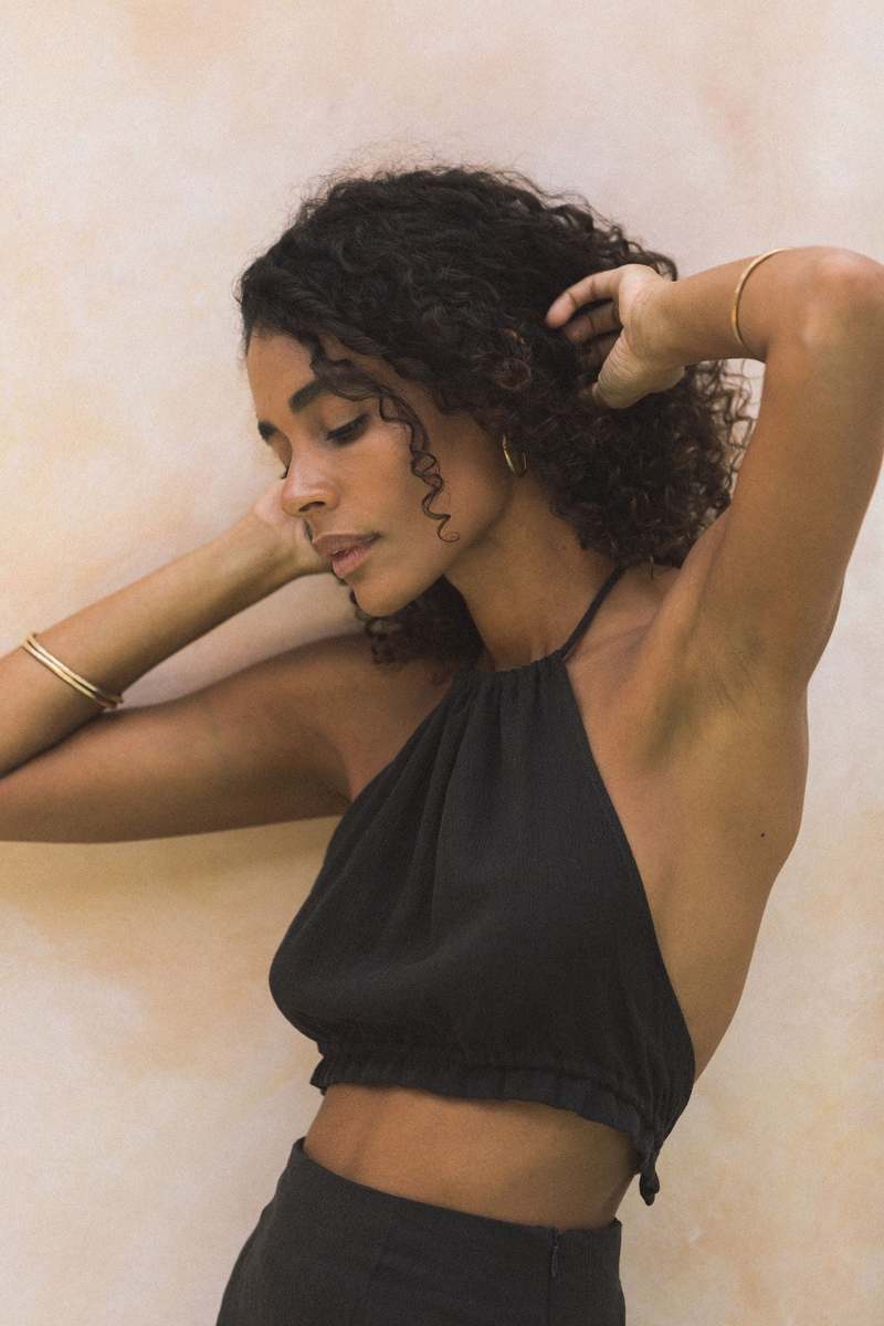 BAHHGOOSE SIGNATURE HAI TOP Easily worn from day to night. Adjust fabric to the front using the drawstring for desired coverage. Model wears size XS/S in charcoal cotton crinkle. Also available in natural & taupe.