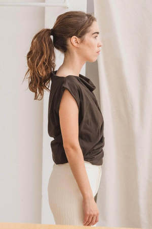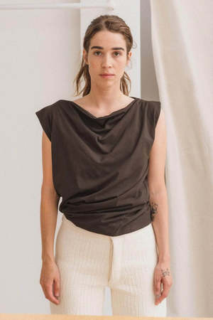 A regenerative cotton jersey tank from Baserange. Twist effect throughout the garment adds versatility. Fit: True to size, designed to fit loosely. Georgia wears size S. Second model also wears size S and is 168 cm tall. Composition: 80% Regenerative Cotton, 20% Recycled Cotton. Care: Machine wash in cold water, hang or air dry. Made in Portugal.
