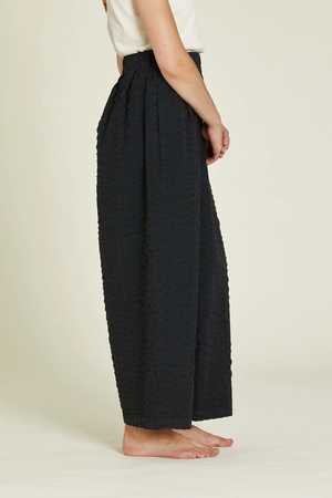 Wide Pants in Black designed by Black Crane slightly oversized fit with a wide seersucker and an elasticized waistband. Creased box pleat details at the front and back, drop crotch, wide legs that are tapered at the bottom, and side slip pockets. Sizing + Details - Made In USA - 100% Cotton - Cold Machine Or Hand Wash, Lay Flat To Dry - Model Stands 5'8" And Wears S XS Waist 12"-17.5", Hip 26", Front Rise 15", Inseam 25" S Waist 13"-18.5", Hip "26.5", Front Rise 15.5", Inseam 25.5" M Waist 14"-19.5", Hip 27", Front Rise 16", Inseam 26" L Waist 15"-20", Hip 27.5", Front Rise 16.5", Inseam 26.5"