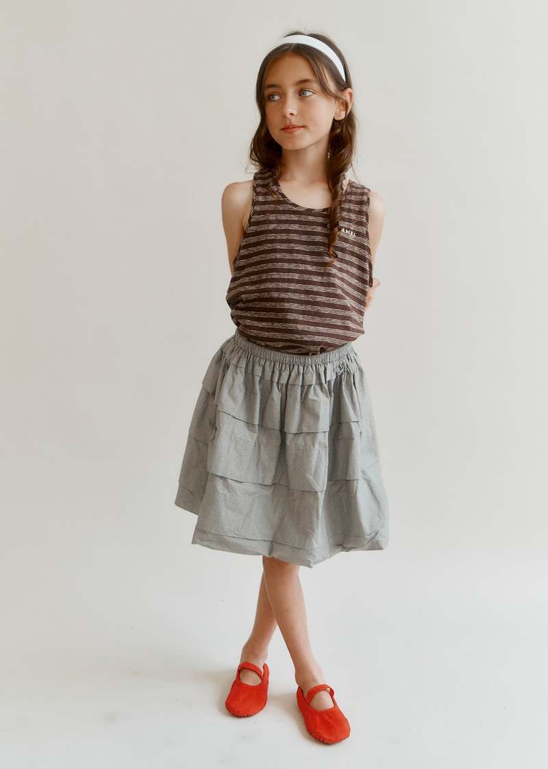 The Anais girl's skirt is a chic addition to any wardrobe. With its tiered, crisp structure, elasticated waist, and brushed cotton lining, the skirt offers a perfect blend of design and functionality. It is crafted from beautiful Japanese hand-dried crushed cotton. The fabric is slightly rumpled, with a lived-in look that adds depth and character to the piece. Anais is a perfectly crafted piece to swoosh, sway, and dance in. Care 100% Cotton