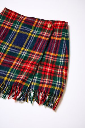 A cute little wrap skirt, made from vintage wool blankets with fringe that will swish as you walk and keep you warm despite its abbreviated length. Wrap button closure. Fit is slightly generous. This skirt features one of a kind textiles that we hand picked. They may include wear, distress, marks, and other signs of age intentionally as we believe this adds to the character of the finished garment. Measurements: Large: waist 34" / hips 42" / length 21" (top of waist to bottom of fringe) 100% vintage wool with cotton trim; dry clean only. Made in Los Angeles.