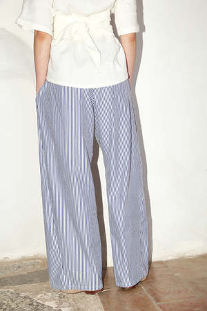 - Elastic waistband fits for comfort - Triangular piece on sides - Inseam pockets - Clean finish binded mini-overlock seams - Colour: Navy & White Stripes - One size only (fits S,M,L) - 100 % Premium Cotton MADE IN BARCELONA