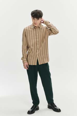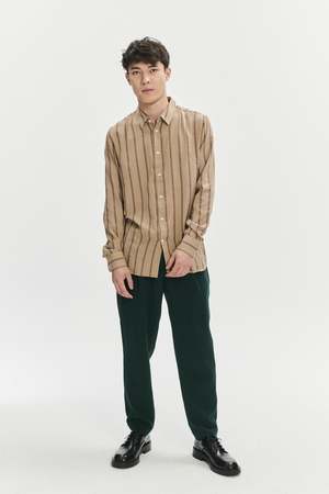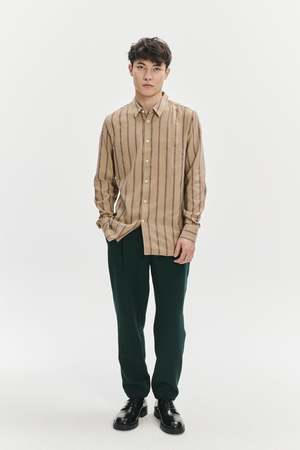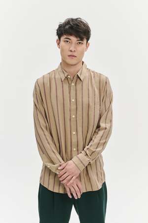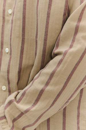 We very much like this subtle beige and Bordeaux red striped herringbone Japanese cotton flannel. The vertical herringbone weave throughout the fabric is suave and relaxed and has a soft touch and summery feel. Composition: 99% Cotton and 1% Polyurethane Designers note: Fine Japanese Herringbone Pre-washed, so no shrinkage One inside chest pocket Natural mother-of-pearl buttons True to size, long sleeve, relaxed fit Model is shown wearing size M Model measures: chest 35.5"/90cm, height 6"/184cm Gentle machine washing at 40C Do not tumble dry as this destroys the fabric