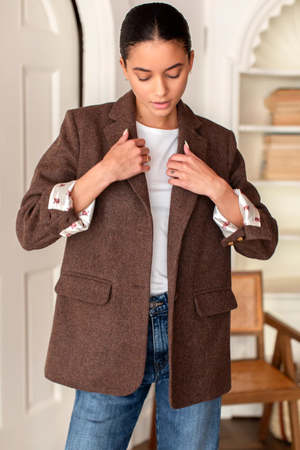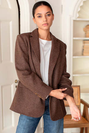 Atelier Blazer in chestnut wool tweed. - Wool - Menswear inspired blazer - Two button closure - Flap pockets with welt detail - Notched collar - Welt chest pocket - Functional buttons at cuff - Lightly padded shoulder - Rear vent - Interior chest pocket - Made in NYC