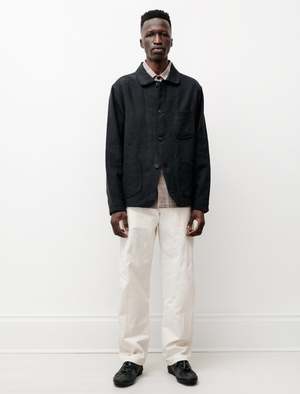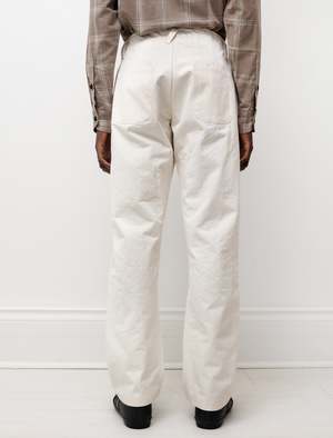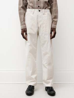A classic four-pocket pant style made from natural-coloured tumbled cotton twill woven in Japan. . This style is slightly relaxed and similar to a jean, featuring top entry front pockets, U-shape back patch pockets, french seams, corduroy internal waistband facing, a button-fly, vegetable-tanned leather washer backed YKK tack buttons and single needles belt loops and detailing. As always, Evan Kinori's pieces are hand-numbered editions made in downtown San Francisco. - Made in USA - 100% Cotton - Relaxed fit - Hand wash - James is 6'1", 145lbs and wears size 30 - Product Measurements SIZE Waist Thigh Inseam Rise Leg opening 30 16" 12.75" 31" 11.5" 8.75" 32 17.25" 13.5" 32" 12" 9" 34 17.5"13.75" 32" 12.5" 9.25" 36 18.5"14.5" 32.5" 13" 9.75"