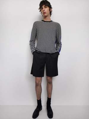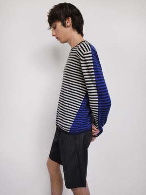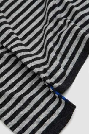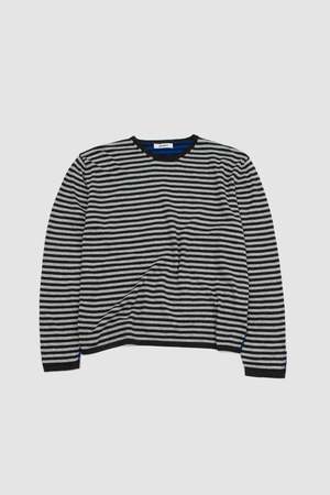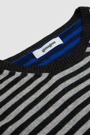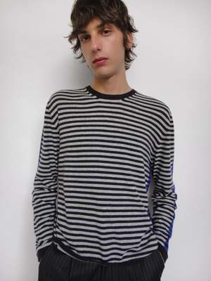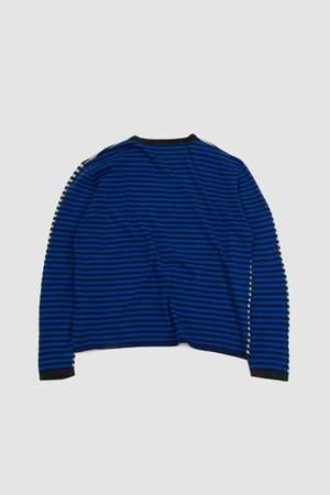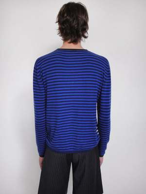Round neck striped sweater in black and grey in the front and navy and klein blue in the back.