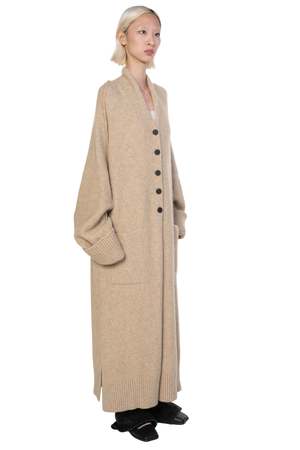 Yak knit long coat with pockets and external stitching details. Horn button closure. Regular fit. Slit at side. Soft and light fabric. Composition: Merino Wool 54%, Yak Wool 22%, PO 19%, Elastane 5%. Made in Italy.