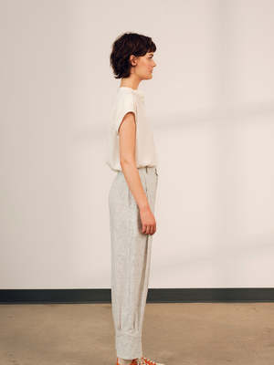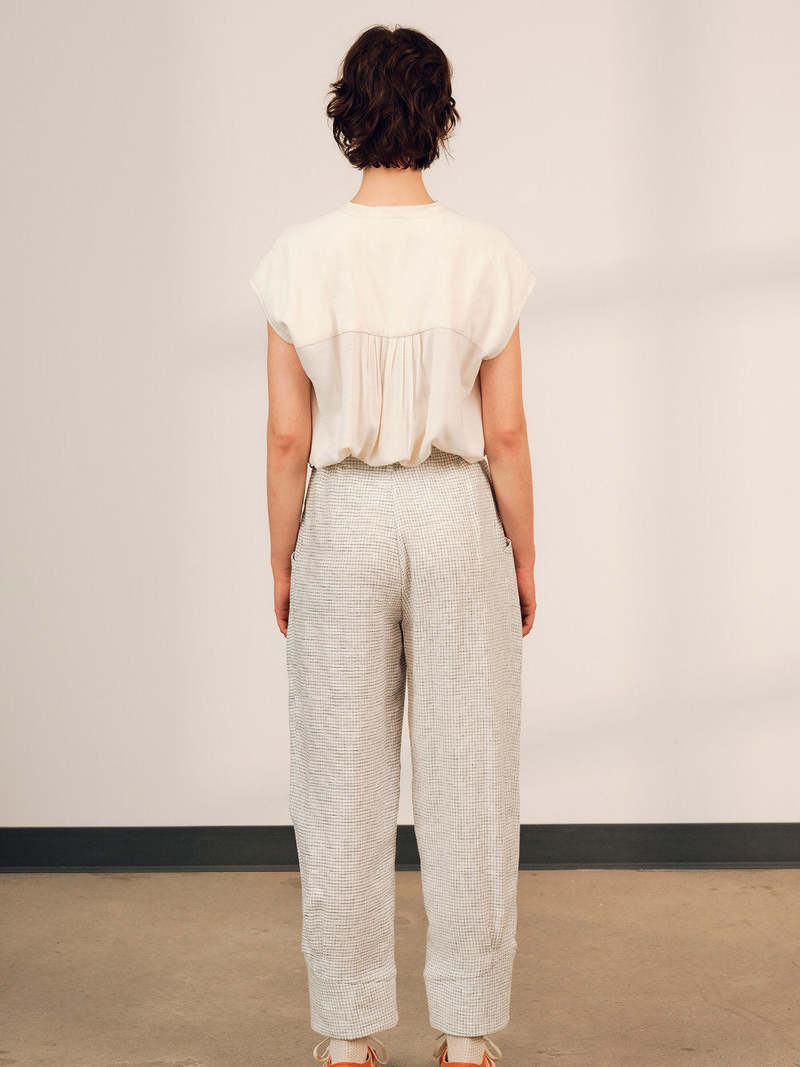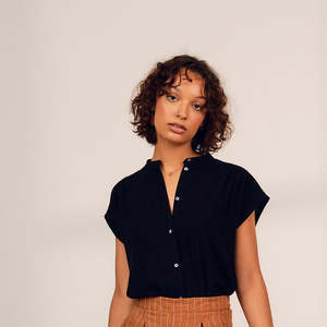 The Lyra is an effortless blouse with little buttons up the front placket and a mandarin collar. Simply the easiest blouse any day of the week. The soft integrated sleeves drape alongside the little shoulder pleats and back pleats. Available Cream (images 1,2,3,) or Black (image 4, separate listing) 92% Viscose 8% Linen Model is 5'8 and wears size XS Total length (neck to hem): 23 Wash instructions machine wash in cold water and hang to dry Made in Montreal