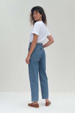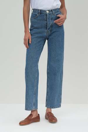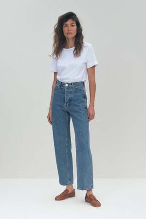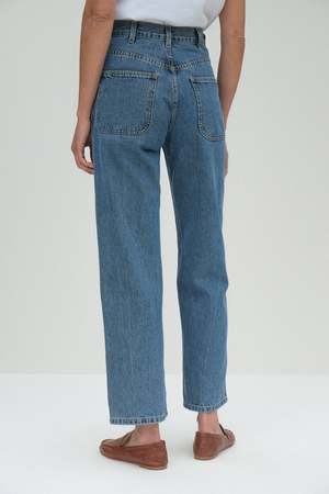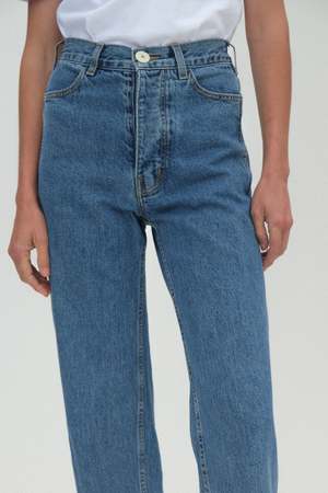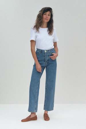 The 225S, the 225th style in Jesse Kamm's collection. A classic plain front jean, this style is made from 13 oz Japanese Denim with the same high waist as all of your other pairs. A straight and simple leg. Fit | For Sizing, get the same size as your canvas pants. Hannah is 58 and wears a Size 2. They will start snug and break in within a few wears. Inseam measures at 29. See measurements for individual sizes. - Size 0 - 24.5" at High Waist, 36" at Hip - Size 2 - 25.5" at High Waist, 36" at Hip - Size 4 - 26.5" at High Waist, 37" at Hip - Size 6 - 27.5" at High Waist, 38" at Hip - Size 8 - 28.5" at High Waist, 39" at Hip - Size 10 - 29.5" at High Waist, 40" at Hip - Size 12 - 30.5" at High Waist, 41" at Hip - Size 14 - 32.5" at High Waist, 43" at Hip - Size 16 - 34.5 at High Waist, 45 at Hip Composition | 100% 13oz Japanese Denim Care | Machine wash in cold water, hang to dry. Made in California