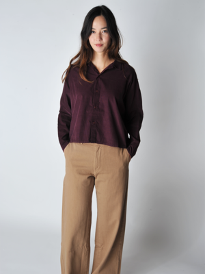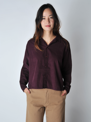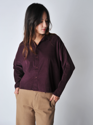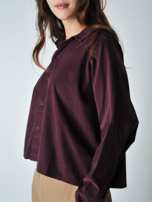 Made in super fin whale corduroy the Tina shirt has a lovely a line shape, button front with collar batwing 3/4 sleeves. Works nicely on its own or layered and worn open or partly buttoned. Color is a lovely deep eggplant. Model is five foot 8, size 4/6 and wearing size 0 100% cotton Made in Italy