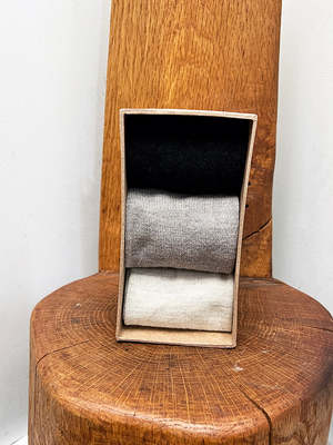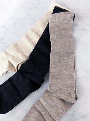 Tall knit socks, about mid-shin pulled up, or wear scrunched. Three colors, offered in a Lauren Manoogian branded boxed set.