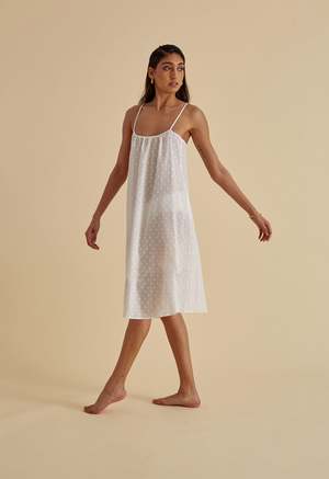 A perfect piece for your everyday wardrobe, our Classic Slip layers under so many styles and also doubles as minimal coverup and next-to-nothing sleepwear. Layer two slips on Summer's stickiest days for the perfect hot weather dress. Pair with cute sandals and bag for all day everyday wear. Available here in our Soft White oversized Swiss Dot fabric and, as always, made in NYC. - Softly rounded ballet neckline - Lightweight, deeply-inset straps - Falls below the knee - Semi sheer