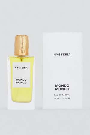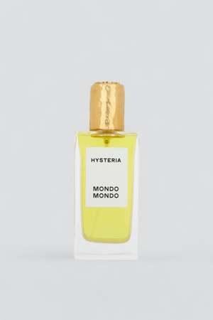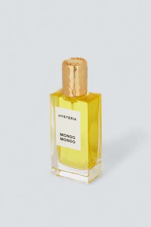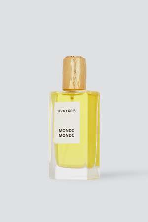 Hysteria Perfume from Mondo Mondo. A surprisingly dry tropical scent; shards of coconut shavings mixed with dried bits of tuberose petals and stems, with bits of palo santo woods chips tossed in. - Notes: Indian tuberose, Indian jasmine, rubberbands, coconut, sunscreen, musk - Ingredients: alcohol, fragrance, water, benzyl alcohol, benzyl benzoate, benzyl salicylate, eugenol, isoeugenol, farnesol, geraniol - Made in USA - 50ml - Alcohol-based fragrances can only be shipped within the US & Canada