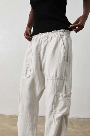 Drop crotch paper bag pants that sits at waist. Features front patch pockets along with smaller side pockets in our linen rayon fabric. 55% Linen 45% Rayon Woven Made in Los Angeles, CA