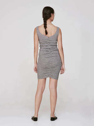 Metaphor dress by Permanent Vacation is a figure hugging dress with flattering gathered details - a reversible design that can be worn with higher or lower neckline at front / back. - Fitted silhouette, finishes mid-thigh - Raw cut edges - Stretchy Japanese gingham, slightly sheer - Composition: 70% polyester, 30% cotton - Brooke is 5'8 and wears S Made in Melbourne, Australia. Size Chart (Inches): We measure each item by hand to ensure the best fit. XS S M L Chest 31 33 35 37 Waist 25 27 29 31 Hip 33 35 37 39 Length 37 37 38 38