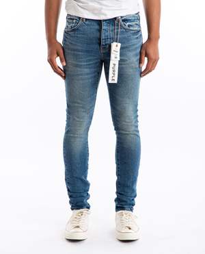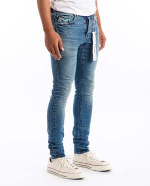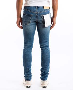 P001 Vaquero Jean in indigo by Purple. Crafted from premium stretch overdyed mid indigo denim, faded by hand, this low rise skinny features five pocket styling, reinforced belt loops, bar-tack stitching, cotton lining for a more comfortable fit. Model is wearing size: 30 Model is: 6'1", Chest 40", Waist 30" 99% cotton, 1% elastane Wash Cold Imported