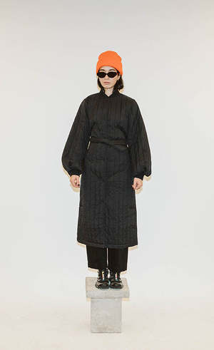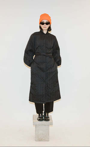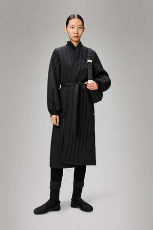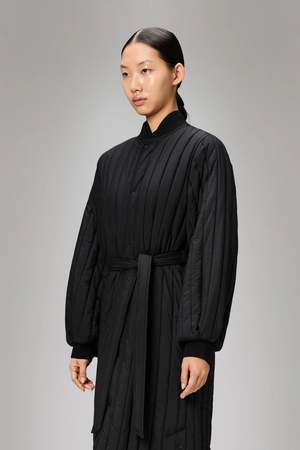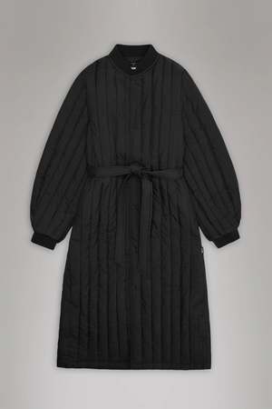 Banja Liner Coat is a versatile long-coat silhouette with light padding and a belt at the waist. Features include a snap button-up closure at front, snap openings at side hem, and two zipped side pockets. Banja Liner Coat has a clean, quilted fit with elastic binding at the front. This jacket is a wardrobe staple that translates well into different looks. The long fit is completed with puffed sleeves and a belt that elegantly accentuates the waist. Its developed to be soft, durable, and breathable. 100% Polyamide Water Repellent Breathable