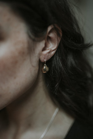 First carved from wax then cast in brass, sweet little pear shaped Cia earrings hang from fixed gold fill ear wires, they measure 1" total length.