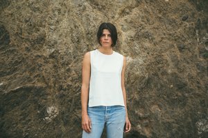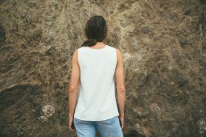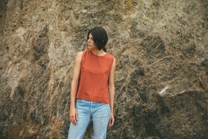 The classic tank top, reimagined as a luxury item. The Silk Noil apron tank has a loose fit and features a high neck, low armholes, side slits, and high-low hem. - Size small length measures 23 1/2" in front and 27" in back - Hand wash cold, line dry - Designed and made in California
