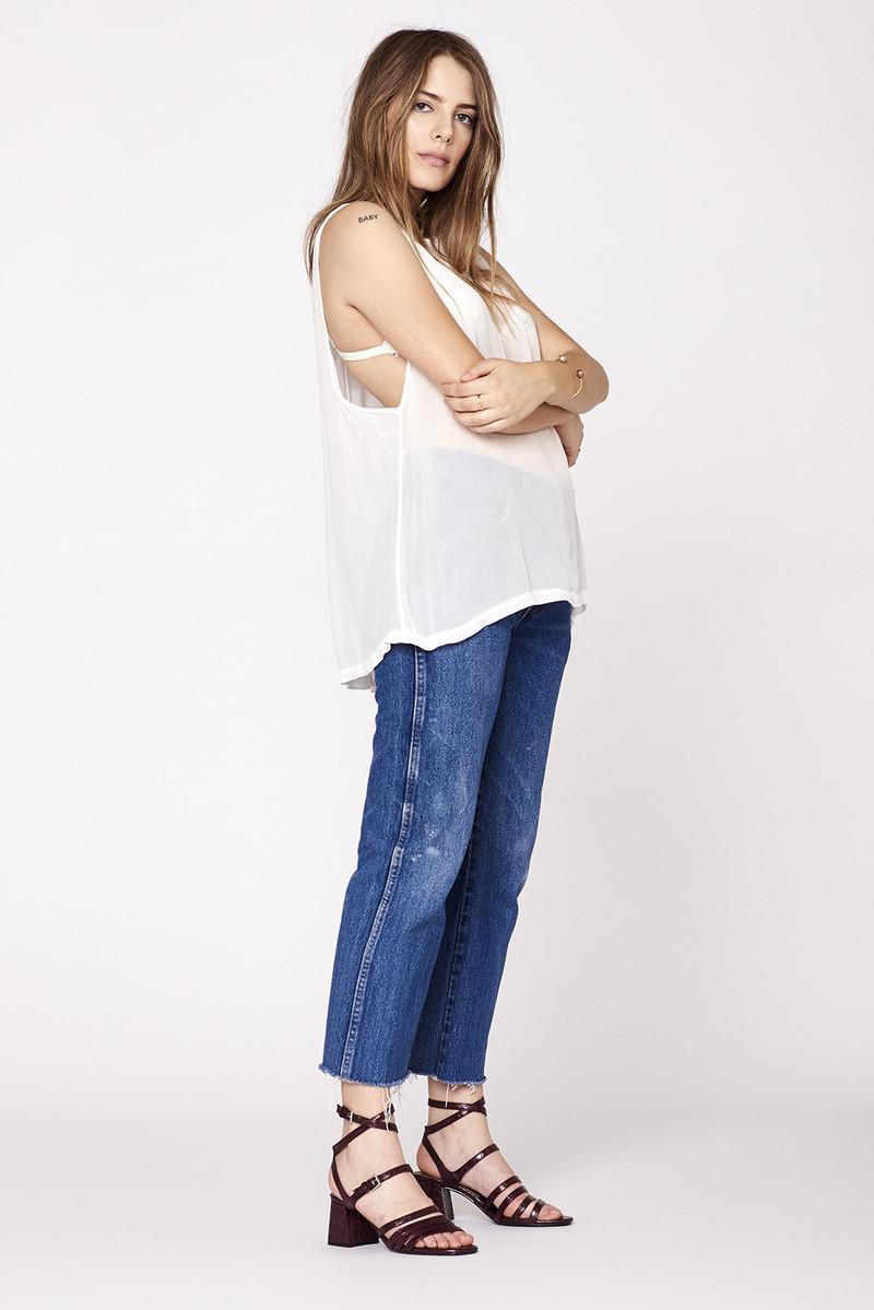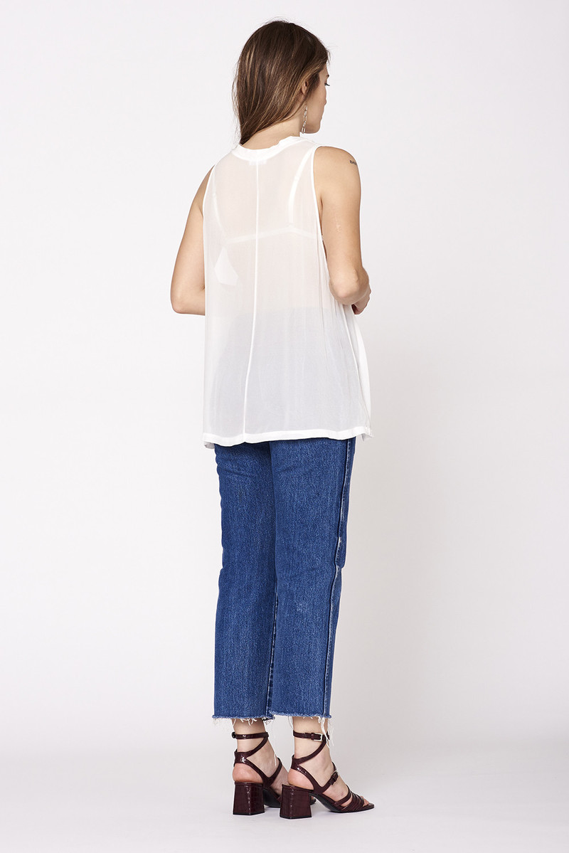 Lightweight + drapey tank with low cut armhole. Cut in a swingy silhouette, sheer, with rounded contrast cotton rib neckline. Perfect for layering. Care -Hand wash. Lay flat to dry. -Made in Downtown Los Angeles. Size + Fit -Flat measurements taken from size Small -Chest: 24 1/2" -Length: 27 1/8"
