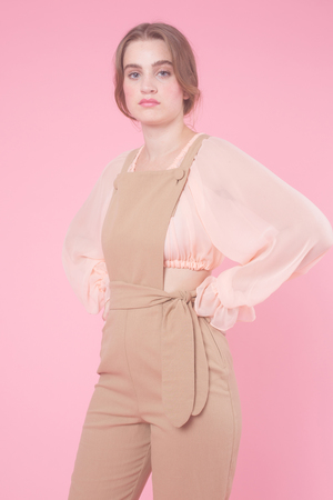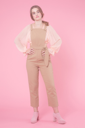 The Backstage Overall is rendered in cotton linen twill and features a classic apron-style buttoned top, waist tie, straight leg and slightly cropped hem.