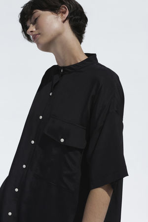 Oversized button down tunic with patch pocket and side slits. Hits mid thigh. Contrast buttons. Pueblo