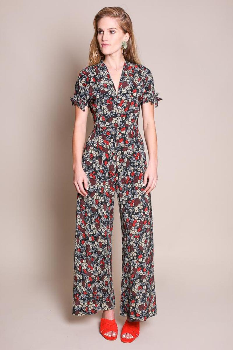 Romantic but still practical. The Althea jumpsuit is silk and features a short sleeve, V-neckline, front button details, pleating, and a full, flared leg.