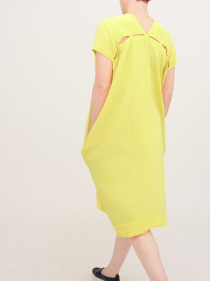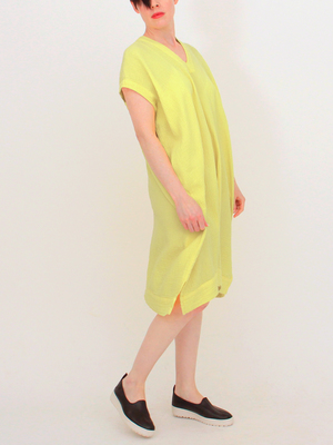 An ultra-soft all day dress. The Crescent dress is a cotton/tencel/poly blend and features a V-neck, cap sleeves, side slits, back slit cutouts, knee length, and a cocoon shape.